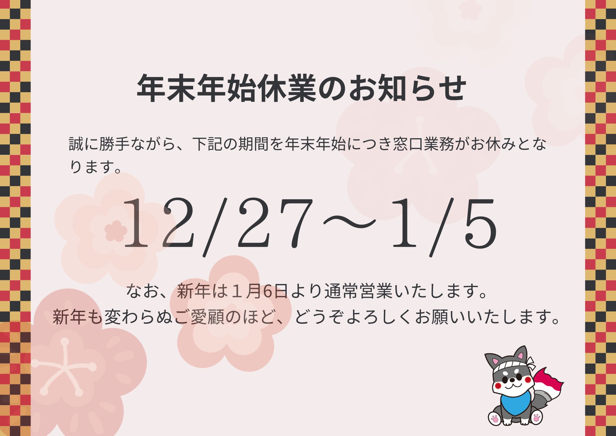 平素より格別のご愛顧を賜り、厚く御礼申し上げます。当社では、誠に勝手ながら年末年始の期間、以下の通り窓口業務を休業とさせていただきます。